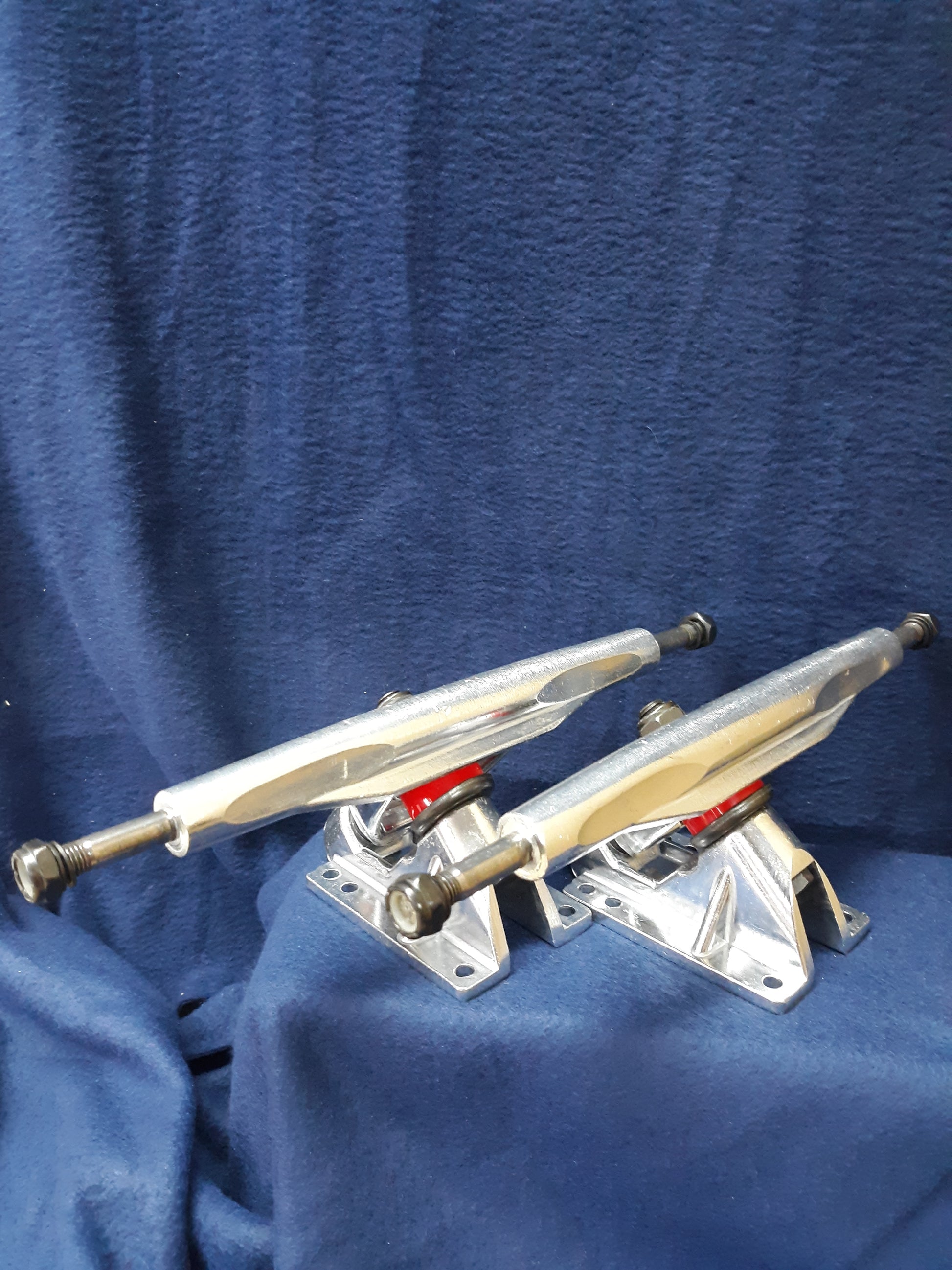 Longboard skateboard trucks. 9 1/2 inches wide for unparalleled stability. Durable construction. Metallic finish. Medium stiff. Sold per pair.
